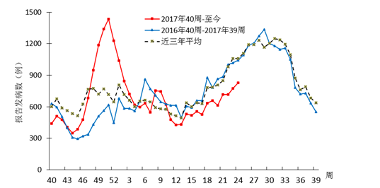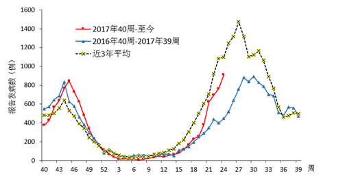 本周报告病例数较上周上升了18.68%,但低于近三年平均水平,见图 1。