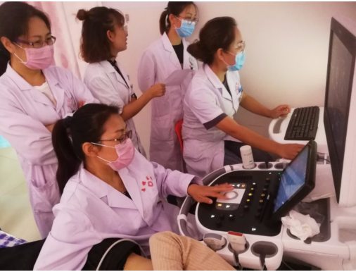 超声科曹红书医生在为患者做检查,并带教当地医生