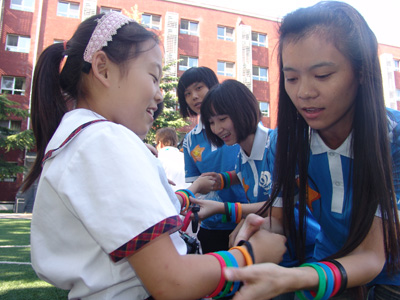 活动中,志愿者为孩子们佩戴了盲文版的微笑圈。孩子们一边摸着微笑圈上印刻的盲文,一边念出印在上面的文字:“志愿者的微笑是北京最好的名片。”志愿者为孩子们讲解不同颜色的微笑圈代表的各自意义。孩子们动人的笑容和爽朗的笑声,感染着在场的每一个人。