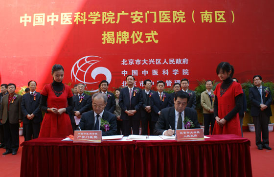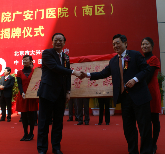 揭牌仪式由区委常委、常务副区长谈绪祥主持。市中医药管理局局长赵静宣读了《关于成立中国中医科学院广安门医院(南区)的决定》。区长李长友、广安门医院院长王阶分别代表区政府、广安门医院签订了委托管理协议书。卫生部副部长、国家中医药管理局局长王国强,中国中医科学院党组书记王志勇,副市长丁向阳,区委书记、开发区工委书记林克庆为中国中医科学院广安门医院(南区)揭牌。