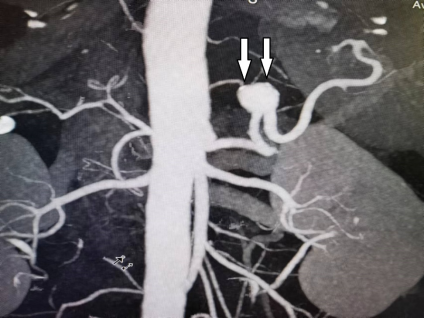 CTA显示脾动脉主干动脉瘤形成,白箭头所指为脾动脉上动脉瘤体。