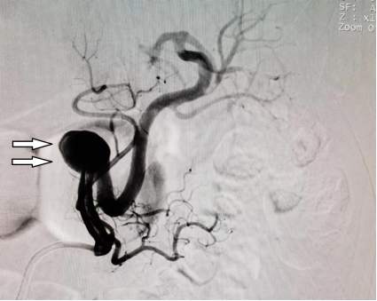 DSA造影显示动脉瘤情况,白箭头所指为瘤体。