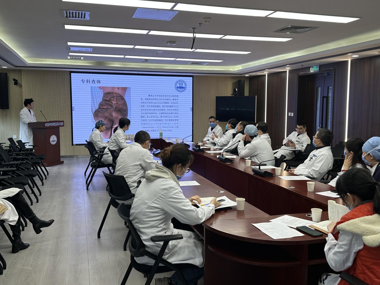 入院后查体发现,小张的巨大神经纤维瘤从腰背部一直延续到臀部下方,体积巨大且形态不规则,CT血管造影、核磁等影像学检查发现瘤体血供丰富,且与脊髓硬膜等深部组织紧邻,手术切除出血和相关风险很大。在医院的支持和医务处的协调下,科室组织了院内多学科会诊,邀请综合整形科、麻醉科、检验科、AICU、放射科、营养科、药剂科等近十个科室的专家共同为小张制定了手术计划及围术期管理方案。