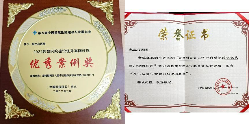 此次评选出的优秀案例将于2023年3月在《中国医院院长》杂志联合多家行业协会共同举办的“2023第五届中国智慧医院建设与发展大会”上进行颁奖。航空总医院被邀请参加现场颁奖盛典,与全国同仁分享交流无人值守自助取药机的开发及应用经验。
