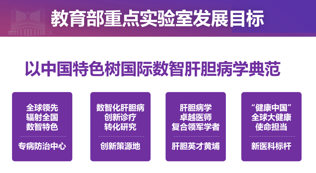 实验室确立四大重点科研任务,一是建构肝胆病学整合式高维数据底座及数据科学研究范式,二是基于高维数据集系统解码肝胆机能及肝病本质,三是肝胆疾病数智化精准防治技术探索与产业转化,四是肝胆疾病精准防治体系的构建与实践,塑造“数据-认知-技术-转化-应用”创新链和科学环,建构肝胆病全周期精准防治体系,助力健康中国战略目标的实现。