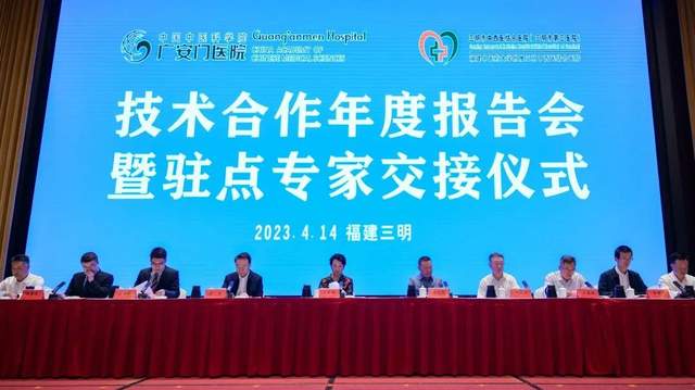 4月14日,中国中医科学院广安门医院与三明市技术合作年度报告会暨驻点专家交接仪式在福建三明召开。我院党委书记王笑频、副院长李杰、首都国医名师冯兴华,三明市副市长张元明出席会议。我院相关职能处室、临床科室负责人代表,第一、二批驻点专家及三明市直医疗单位、各总医院分管领导,市直医疗单位、各县(市、区)中医院中医专业医务人员代表等参加会议。