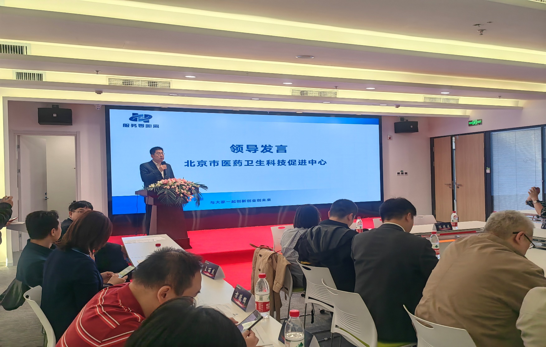 市医药卫生科促中心张静波主任、赵国宏副主任、何远智副主任,中关村科技园区丰台园管理委员会产业二处赵颖慧处长、中关村企业家顾问委员会刘进副秘书长等领导出席,医药卫生科促中心相关部门、创促会会员单位、医药健康领域孵化服务机构及企业代表共计60余人参与本次活动。