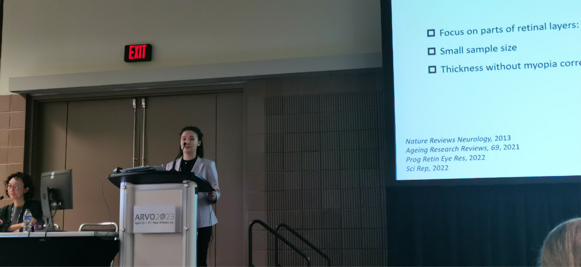 李子涵同学在发言中汇报了在人群研究中视网膜各层的厚度与认知功能障碍之间的关系,矫正了年龄、眼轴长、受教育程度等混杂因素,发现视网膜厚度与认知功能存在性别差异。