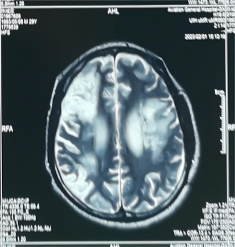 急诊行“开颅血肿清除及侧脑室穿刺引流术”,术后患者因持续较长时间昏迷不醒,予以气管切开治疗。住院治疗期间患者多次出现肢体抽搐伴意识丧失的癫痫发作,予以镇静药物治疗,在住院期间复查头CT检查时又发现新发多处脑梗死灶,继续予以抗癫痫、抗炎等药物治疗。经过5个月的治疗和康复,患者虽可自动睁眼但意识仍未清醒,头偏向右侧、双眼向右侧凝视、气管切开的状态,四肢无明显自主活动,且肌张力增高。