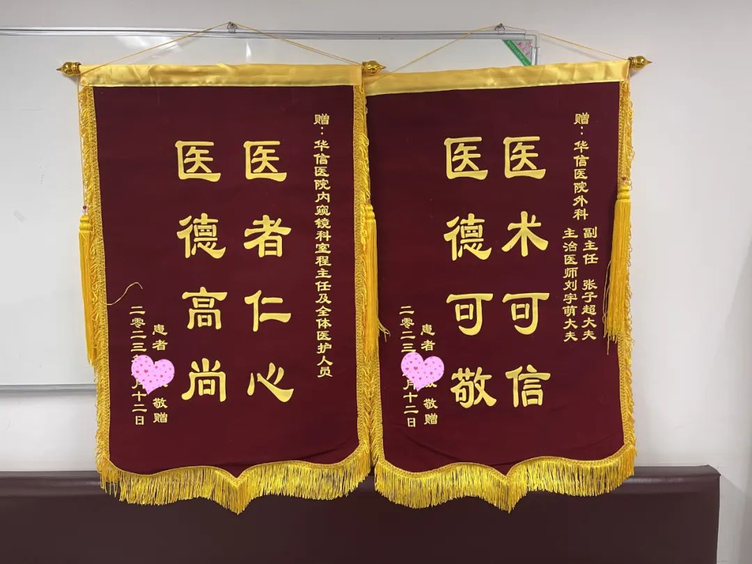 经过治疗后,患者症状缓解,胀气的肚子终于恢复正常,笑容也回到了她脸上。经过后续一系列治疗,恢复良好后出院。在近日门诊复查时情况良好,患者还向普外科和消化内科赠送了锦旗以表达感谢之情。