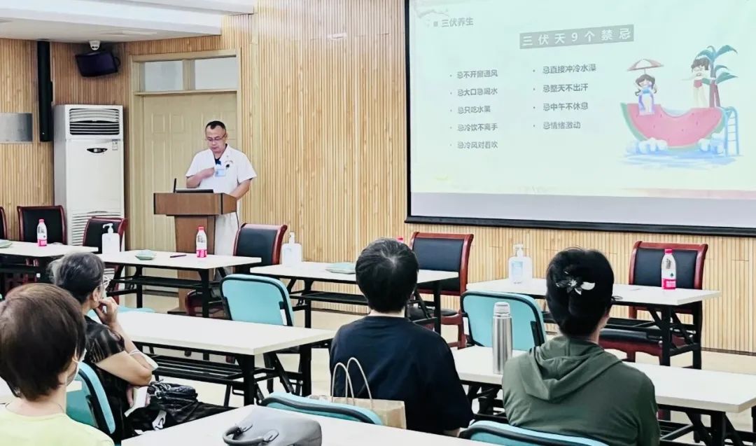 会议结束后,推拿科任蒙强主任医师以《三伏天养生》为主题,为居民讲解三伏天的注意事项和养生方法。“罗素兰名老中医传承工作站”、“贾春华名老中医传承工作站”的指导老师和继承人开展义诊活动,用实际行动为群众办实事、做好事。医护人员现场为大家进行血压测定、贴敷治疗、干扰电、艾灸、拔罐和耳穴埋豆等多种形式的义诊服务。同时向居民科普常见病的注意事项、饮食作息、运动方式、药物治疗等相关知识,为居民进行健康生活方式指导。
