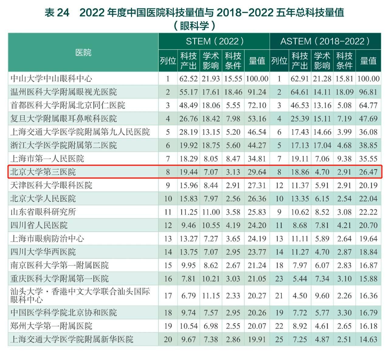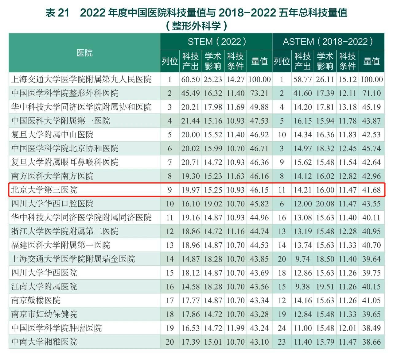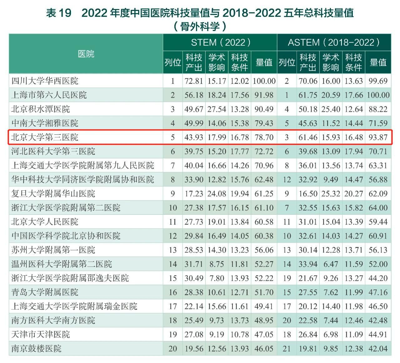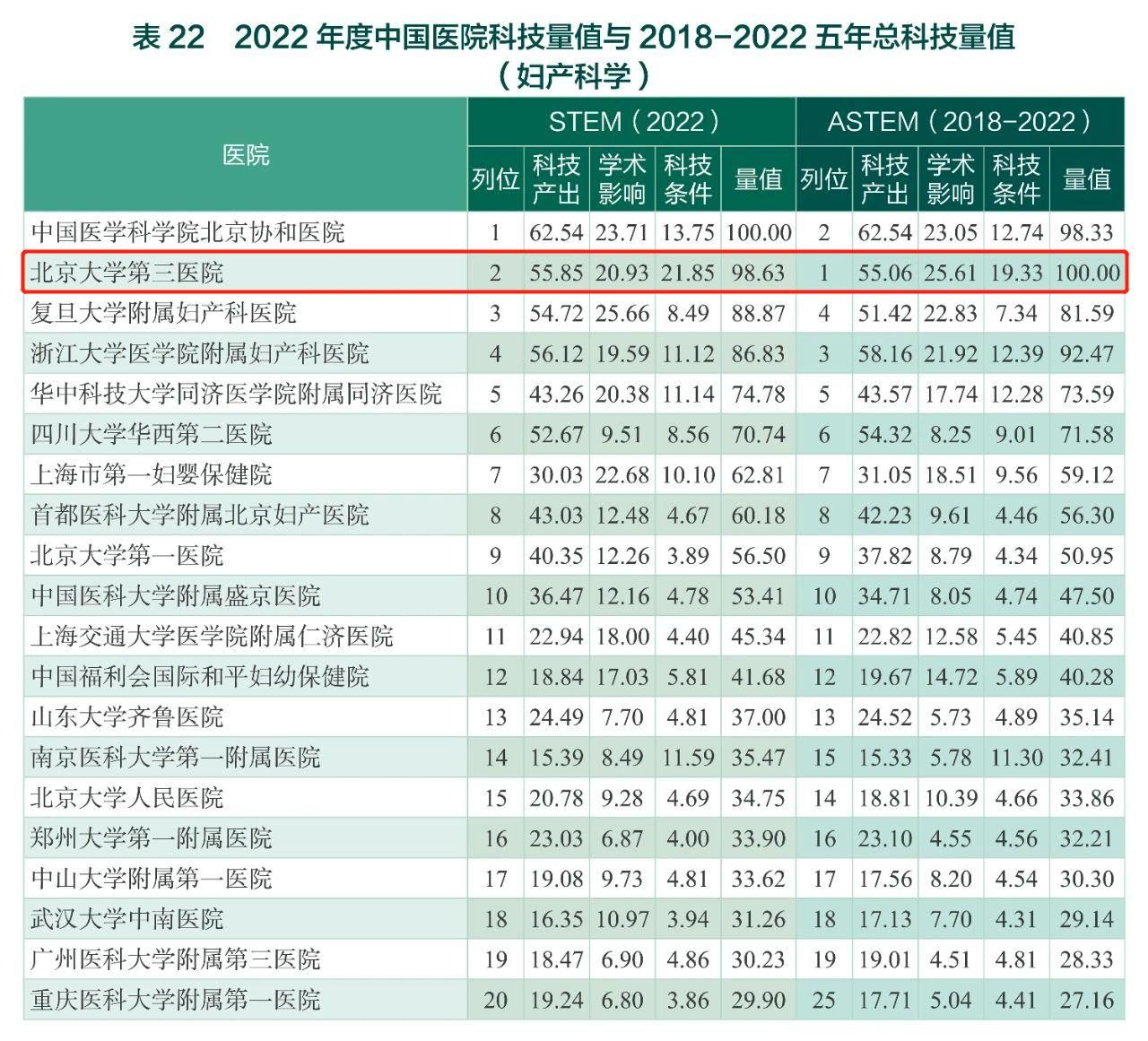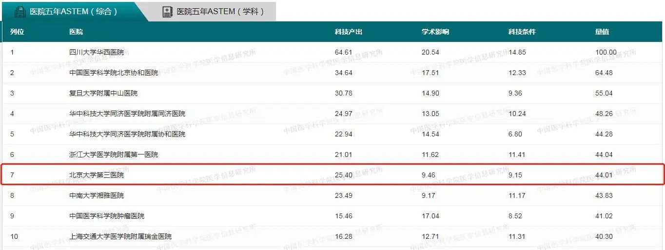北京大学第三医院在2018-2022五年总科技量值(ASTEM)榜单中排名第七