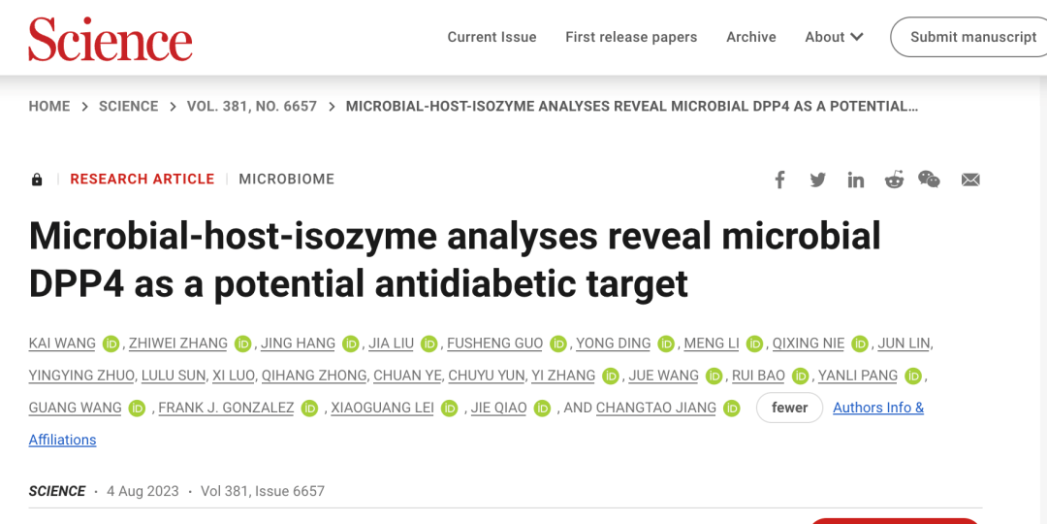 2023年8月4日,北京大学医学部基础医学院教授、第三医院特聘教授姜长涛团队,北京大学第三医院乔杰院士团队,北京大学化学学院雷晓光教授团队与合作者,在Science上共同发表了题为《肠道菌源宿主同工酶分析揭示菌源DPP4作为抗糖尿病新靶点》(‘Microbial-host-isozyme analyses reveal microbial DPP4 as a potential antidiabetic target’)的重要研究成果,揭示了肠道菌群如何影响西格列汀临床响应性、肠道菌源宿主同工酶跨物种调控代谢性疾病的新机制,为解开西格列汀临床响应性之谜提供了答案。