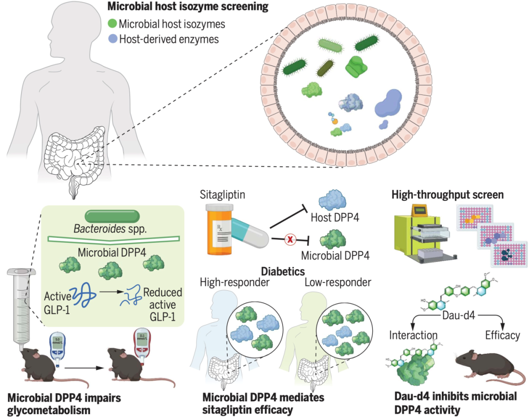 研究人员发现菌源二肽基肽酶4(DPP4)可以通过分泌进入宿主体内并分解活性胰高血糖素样肽-1(GLP-1),进而诱导糖耐量异常。同时,他们发现宿主DPP4抑制剂西格列汀无法有效抑制菌源DPP4的活性。如果患者体内菌源DPP4富集,将会降低西格列汀的临床治疗效果。这一发现揭示了西格列汀临床响应性的个体差异的机制,并找到了关键的作用靶点。