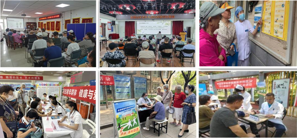 宣传周活动期间,石景山区开展了一系列主题鲜明、形式多样的宣传活动。各医疗机构结合实际工作,采取集中宣传、专家义诊、讲座等方式,对辖区内老年人进行了老年健康知识和健康服务政策普及。其中,八宝山、老山社区卫生服务中心等在社区开展了健康讲座;广宁社区卫生服务中心、金世界社区卫生服务站通过签约居民微信群、门诊宣传、发送短信等方式组织老年人参加中医药膳食健康讲座;北京大学首钢医院在门诊大厅、中国医学科学院整形外科医院在社区。北工大社区卫生服务中心在大学校园为老年群体展开了“关爱老年群体,健康与爱同行”、“同心健康行”等主题义诊活动,为老年居民测血压、测血糖、健康检查和健康咨询,并向他们讲解卫生健康知识和老年人常见的疾病保健知识。五里坨医院、北京联科中医肾病医院联合在春晖颐养老院举办了“预防老年人跌倒”的健康讲座。从老年人要选择合适的衣裤鞋,合理安排家居摆放,增加辅助器具,环境进行适老化改造,出行前要考虑安全性等方面进行了细致的指导。区老龄中心组织医疗机构播放了石景山区卫生健康委制作的《老年人防跌倒》宣传片,各医疗机构还利用海报、折页、电子大屏等多种宣传载体传播老年健康知识,其中张贴海报、发放折页等各类宣传材料共2877份。宣传活动的开展提高了老年人群的自我保健意识,传递了健康生活理念。