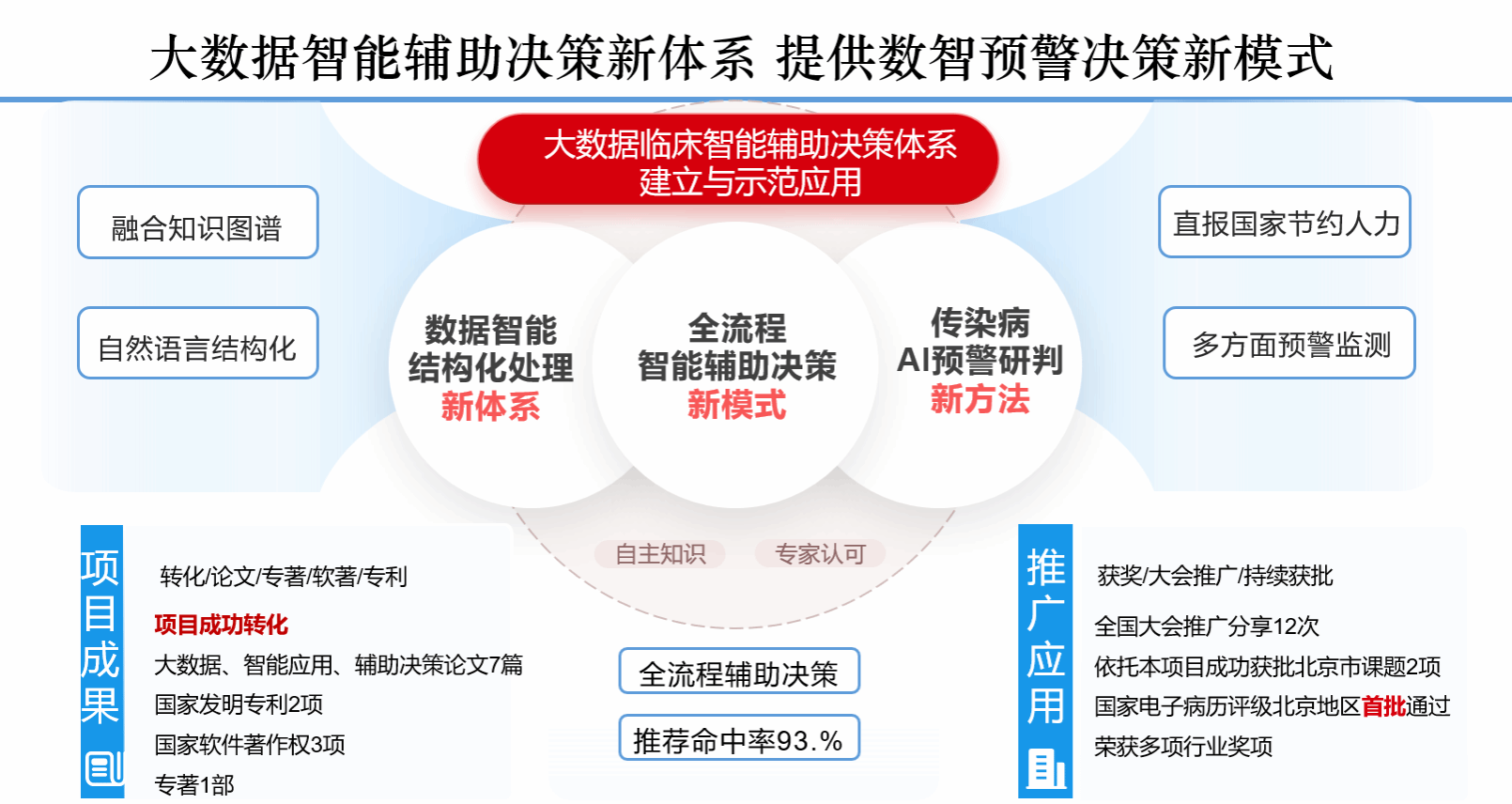 1、构建基于循证医学与临床真实大数据的结构化数据体系。通过建立标准化大数据中心,提供了将大量文本数据标准化形成可利用数据的路径方法,融合指南的知识体系支持临床、科研等多场景的数据利用。2、构建基于结构化标准化大数据与循证医学的全程临床辅助决策模式,实现对疾病及病历内涵质控的智能化辅助决策。3、国际首次构建可真实应用于医院传染病预警监测的AI智能化方法。通过基于实时数据结合AI模型,实时监测传染病发病情况。传染病多维自回归深度学习模型,对多种传染病流行趋势预判预警,为传染病主动监测提供了重要研判手段。