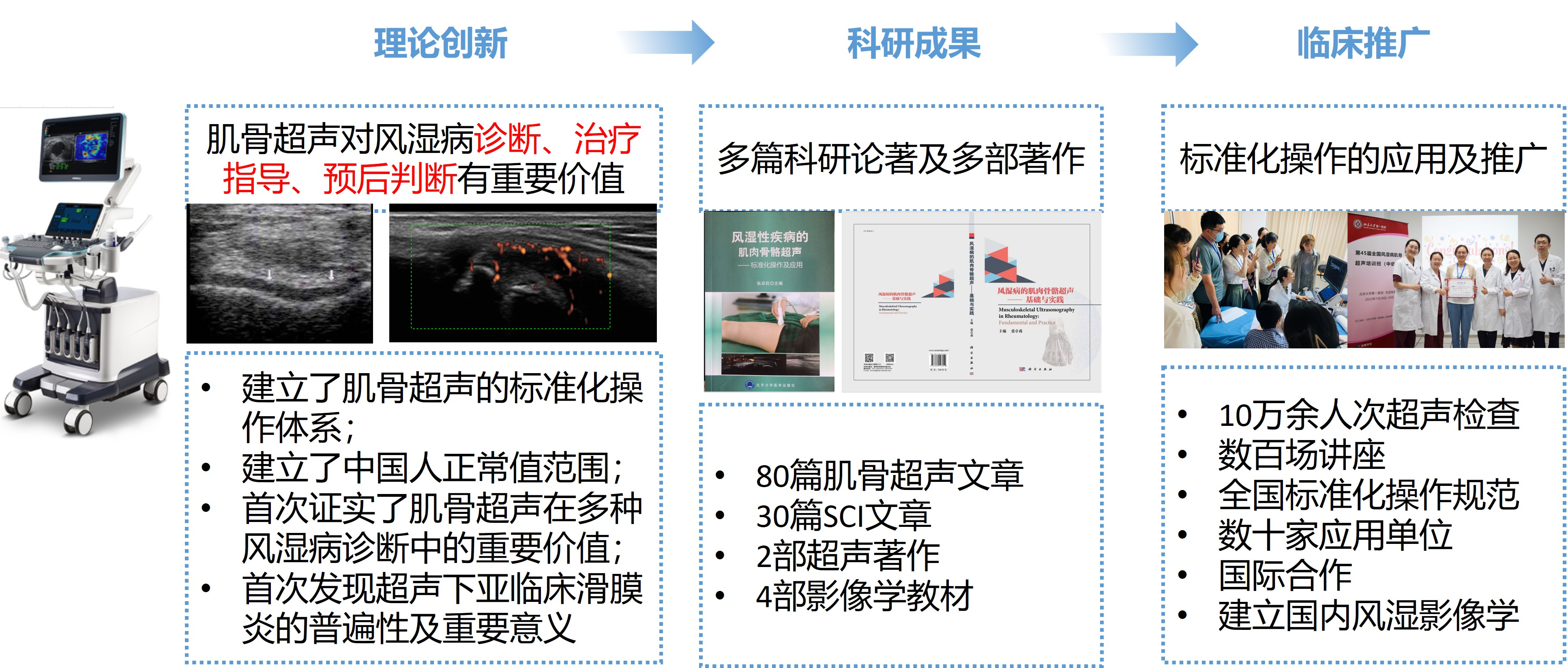 影像学技术在风湿病诊治和患者管理中至关重要,以往临床中使用的是传统X线和CT,超声技术在风湿病学科的应用极为有限。2009年开始,北京大学第一医院风湿免疫科在国内率先将肌骨超声用于关节炎等多种风湿病的诊断、鉴别诊断、随访、治疗指导、预后判断各个患者管理环节中。十余年来,团队证实了超声较单纯临床检查的优越性,建立了肌骨超声的标准化操作体系和适合我国患者的简化超声评价体系;建立了中国人正常值范围和患者人群的超声图库;首次证实了肌骨超声在类风湿关节炎、银屑病关节炎、痛风及干燥综合征等多种风湿病的早期诊断及分型中的重要价值;在国际上首次发现超声下亚临床滑膜炎的普遍性及对于预后的重要意义,证明了肌骨超声在各种风湿病患者长期随访及治疗中的指导价值。