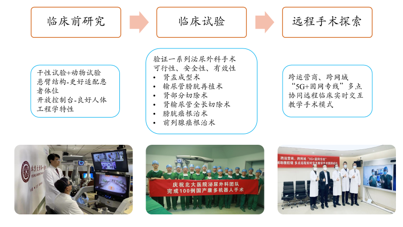高端医学装备的创新转化是我国医学装备自主发展的重要一环,作为重点医学装备,外科手术机器人系统在我国“十四五”医疗装备产业发展规划中被反复提及。《国产康多机器人手术系统关键技术的建立与临床应用》项目是国产康多机器人临床试验团队历经15年取得的重大创新成果,在北京大学泌尿外科研究所所长周利群和泌尿外科主任何志嵩的全力支持下,在北大医院李学松教授、谌诚主任医师、北京协和医院纪志刚教授的带领下,先后完成干性试验和动物试验等一系列重要的临床前研究,此后圆满完成了国产康多机器人肾盂成型术、输尿管膀胱再植术、肾部分切除术、肾输尿管全长切除术、膀胱癌根治术、前列腺癌根治术等一系列临床试验,获得了宝贵的临床数据,随后完成跨运营商、跨网域“5G+固网专线”多点协同远程临床实时交互教学手术模式的探索,充分评估并验证了国产康多机器人应用于多种泌尿外科手术的可行性、安全性及有效性。