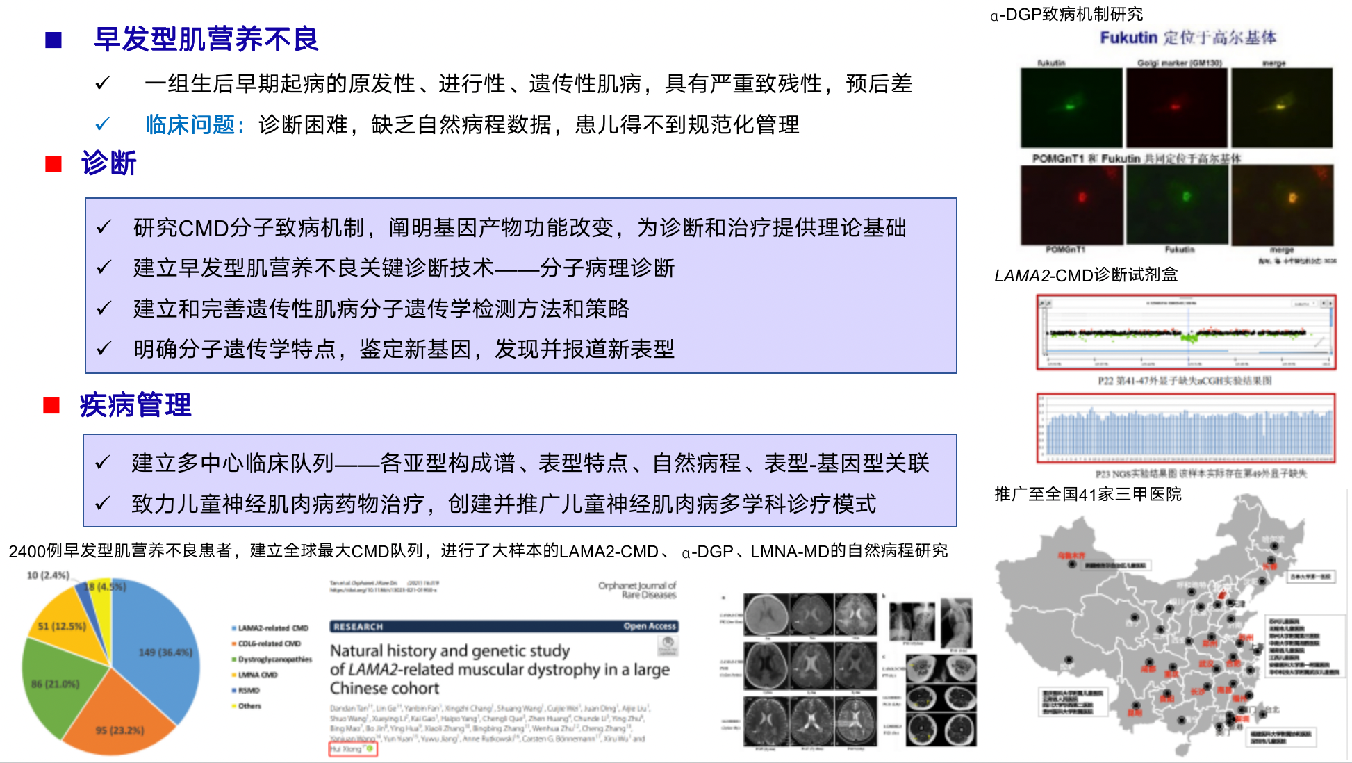 本项目在国内90%地区进行推广,产出代表论文88篇,20篇代表论文被引用295次,撰写综述、并牵头制定专家共识,参编多部遗传性肌病论著和罕见病调研报告等,使我国CMD研究和临床诊治整体水平跻身于国际领先行列。(项目主要完成人:熊晖、谈丹丹、常杏芝、魏翠洁、范燕彬、王爽、刘洁玉、袁云、张弘、吕俊兰、宋丹羽、杨海坡、傅晓娜、葛琳、黄真)