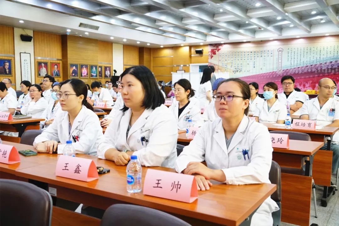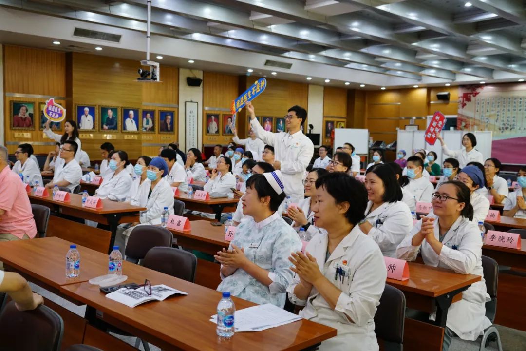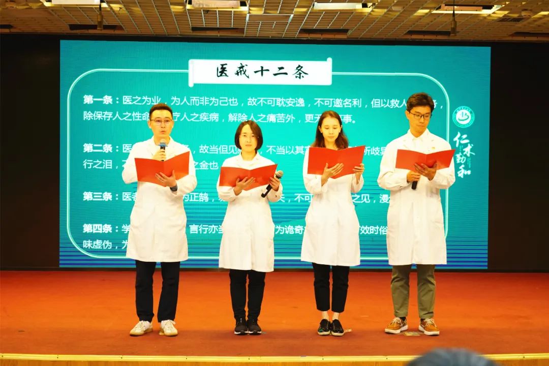 “医之为业,为人而非为己也,故不可耽安逸,不可邀名利,但以救人为本务,除保存人之性命,治疗人之疾病,解除人之痛苦外,更无所事事……”伴随着风湿病科侯堃、运管办郝晋、感染科孙宁宁、医保办黄筱蕾朗朗的诵读声,全场一起重温了施今墨老先生的《医戒十二条》。