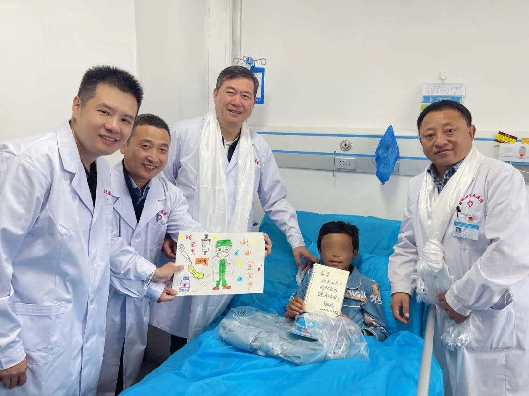 如今,4年过去,和上次躲着不敢进手术室不同,手术当天等待麻醉的拉吾乖乖躺在台上,勇敢地和主刀医生董家鸿碰拳,完成了这一场关于消灭包虫、健康成长的约定。