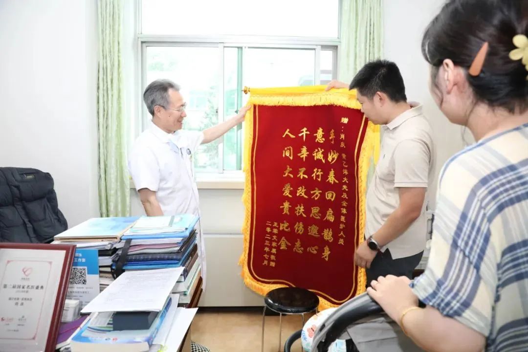 8月10日,患儿家属向神经外四科赠送锦旗。患儿出生后发育较同龄儿稍差,2年来一直保守观察,精细活动受影响,才经北京某权威三甲医院么医生推荐,来问诊航空总医院肖庆主任,诊断患儿为脑积水、后颅窝蛛网膜囊肿,脑功能受损,身体发育迟缓。肖庆主任为患者行神经内镜检查术+脑内囊肿开窗造口术+神经内镜下第三脑室底造瘘术,家属十分感激,送上原创锦旗,“早知道这么微创就能解决,何苦2年来担惊受怕还耽误了孩子生长发育。”