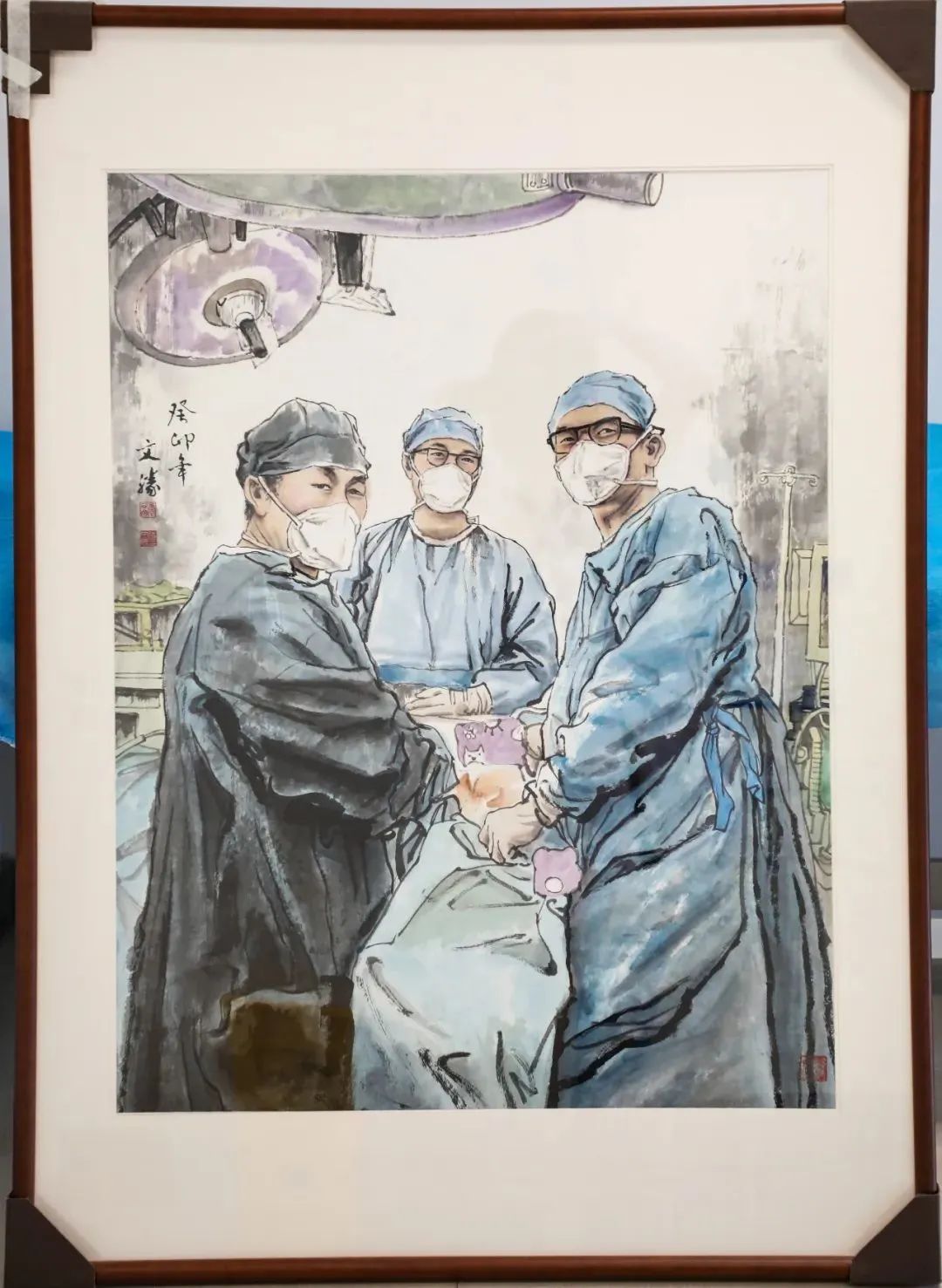 今年4月,乳腺患者向乳腺外科赠送绘画作品。年底北京疫情高峰期,患者求医无门,终于找到航空总医院乳腺外科耿凤勇主任。耿主任临床确诊患者为乳癌后,及时进行了乳腺癌改良根治术+腋窝淋巴结清扫术。图中三名医师均刚刚转阴,手术结束后拍照留恋,并相互鼓励“乳腺外科打响全面复工复产第一枪!”患者家属借照片为蓝本送上字画,同时上书:“赞美医生他们奉献的是一丝温情,一份关爱,一滴汗水,一份真情。他们奉献的是最宝贵的青春,换来的是千家万户的幸福和健康拥有者的安详。”