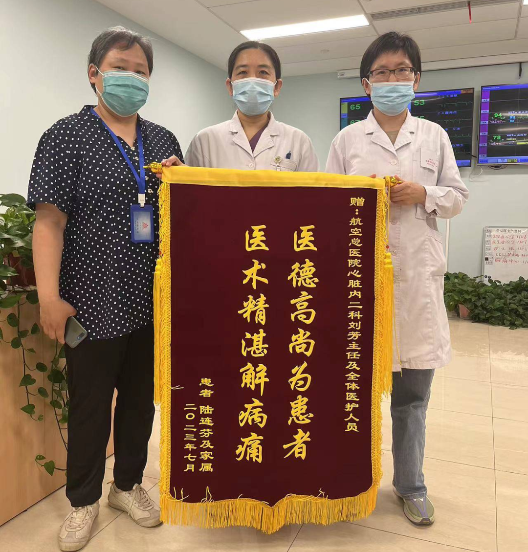 今年7月,患者及家属为心内二科送上锦旗。患者为84岁女性,因重度喘憋伴双下肢水肿入院,诊断急性心力衰竭,肺部感染,双侧大量胸腔积液,高血压病等多种基础病,入院后喘憋严重,出现一型呼吸衰竭,多次向家属下达病重通知,同时予以无创呼吸机辅助呼吸,胸腔穿刺引流积液及改善心功能,抗感染等对症治疗。在大家共同努力下,患者病情好转,术后恢复良好。