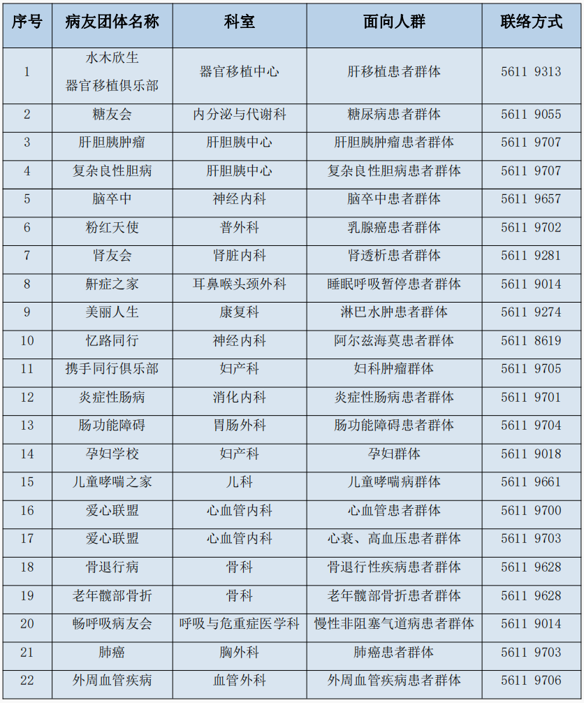为进一步畅通患者就医与疾病支持渠道、搭建促进病友互助支持平台,现整理公布我院各病友团体资源清单,如果您有相关疾病咨询或者想加入病友团体,可于工作日工作时间拨打咨询电话。