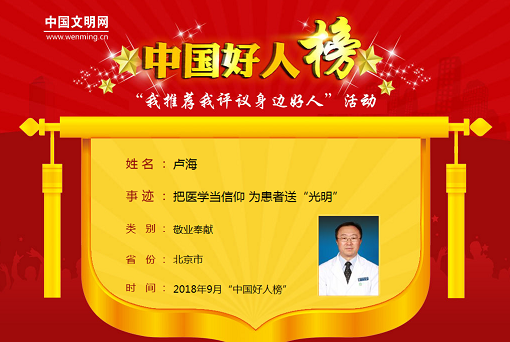尽管专业不是自己的首选,但是卢海很快便喜欢上了眼科,特别是当他看到经他治疗的患者摆脱黑暗重见光明的时刻,他感到特别欣慰和自豪。记得有一次,卢海在赴内蒙扶贫活动中,为一位因患白内障失明13年的90岁老人实施了复明手术,当他为老人揭开纱布时,老人终于看见了10多年未曾谋面的女儿,不禁老泪纵横,她拉着女儿的手说:“你都老了”,母女俩相拥而泣。那一幕深深地印在卢海的脑海里。他突然强烈地意识到,眼科医生对于他,不仅仅是一个职业,更是一份责任、一份光明的事业!