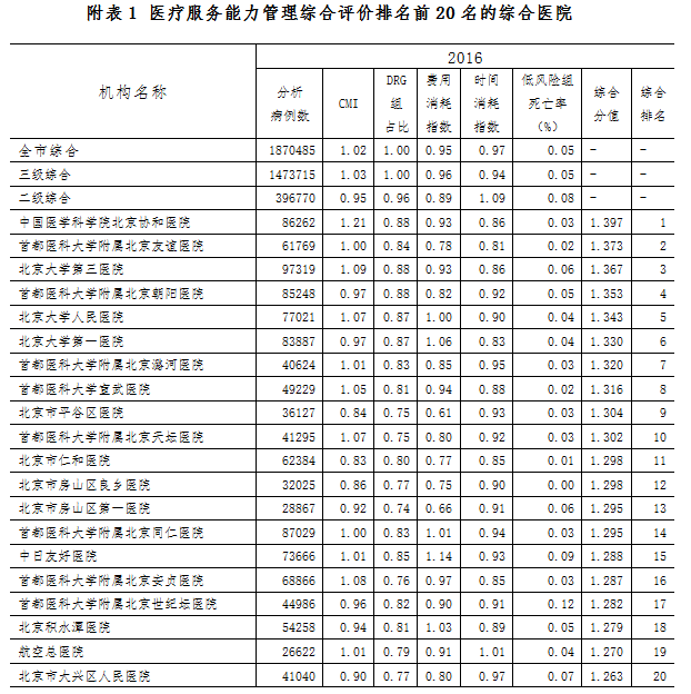 综合59家综合医院在“医疗能力”、“医疗服务效率”和“医疗安全”三方面的表现,根据各指标权重,最终得出59家医院在医疗服务方面的综合绩效总分值。2016年,医疗服务能力管理综合评价排名前20名的医院见附表1。
