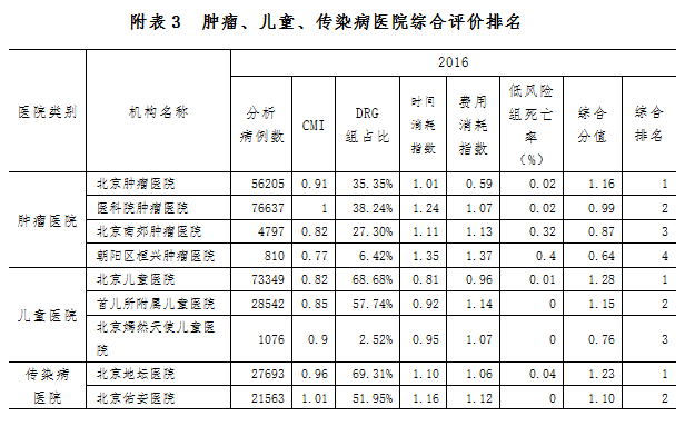 专科医疗机构评价部分,主要选取了妇幼、肿瘤、儿童、传染等4类专科医疗机构进行评价。2016年,满足DRG评价条件的医疗机构共包括17家妇幼类专科医疗机构、4家肿瘤医院、3家儿童医院和2家传染病医院。