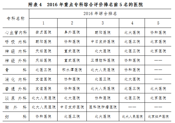 应用以上评价方式,对2016年有关医院的心血管内科、呼吸内科、神经内科、神经外科、骨科、消化内科、普通外科、泌尿外科、妇科等10个专科进行了综合评价,每个专科排名前5名的医院见附表4。
