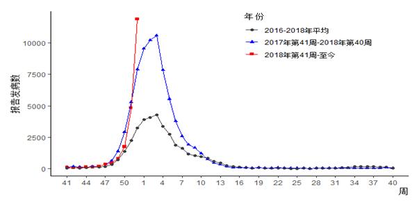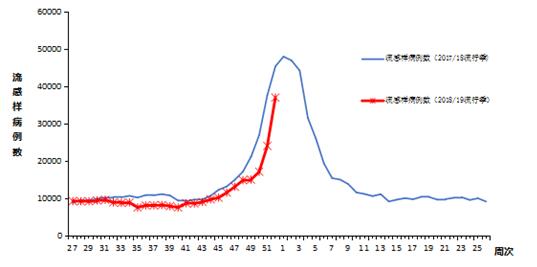 流感样病例数(2018/19流行季) インフルエンザ様症状の病例数(2018年/2019年の流行期間)