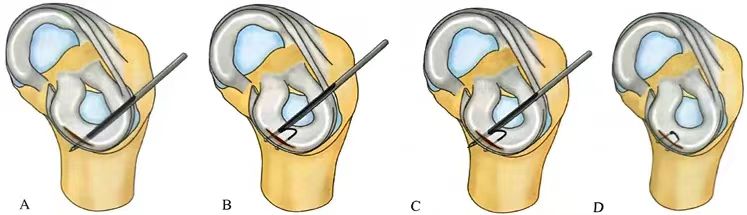 All-inside缝合技术A.缝合器针头穿入半月板,穿至关节囊外;B.同样的方法推出第2个结;C.抽出缝合器;D.用推结器将结拉紧、剪线,完成缝合。