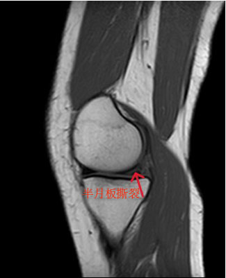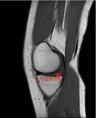术前右膝关节冠状位核磁可见半月板在多个层面上出现高信号(红色箭头所指位置)