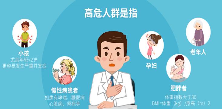 对于年龄5岁以下的幼儿及65岁以上的老年人,有心肺基础疾病、恶性肿瘤、免疫功能抑制、糖尿病、肥胖及孕妇等,是重症病例的高危人群,一旦出现流感样症状,应高度重视,尽早进行就医治疗。
