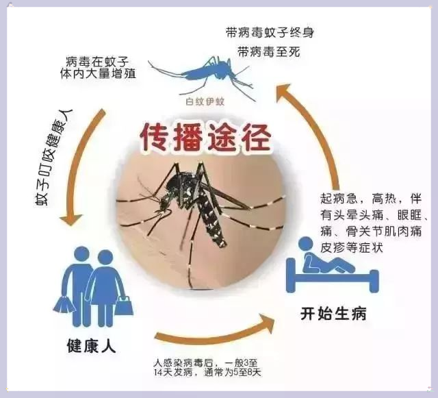 有症状的患者和隐性感染者是主要传染源,媒介伊蚊叮咬传染源后,病毒在伊蚊体内复制8-12天后可传播病毒且终身具有传染性,当它再次叮咬健康人可进行传播。
