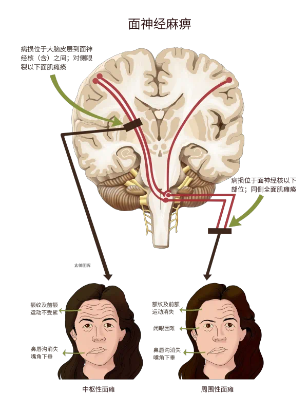 根据面神经损伤部位分为中枢性面瘫和周围性面瘫。