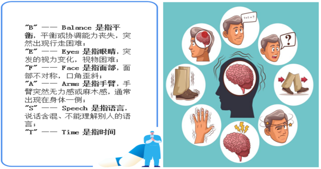 2021年7月,中国卒中学会在第七次学术年会期间正式发布了识别卒中早期症状的"BE FAST 口诀",前5个字母各代表一个早期症状,最后1个字母是提醒一旦发现卒中症状,应立即拨打急救电话,尽快就医。