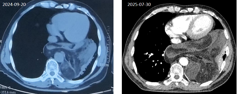 患者老王怎么也没想到,一年前一次常规体检,竟在他体内发现了一颗“定时炸弹”,后纵隔有一个12cmX13cm的肿物,以脂肪密度为主。“这么大个东西,我咋一点感觉没有?”老王看着报告,心里虽有嘀咕,但身体确实没有任何不适。他觉得不痛不痒,便没太当回事,选择了“观察”。然而,他不知道,这个潜伏在胸腔“核心区”的肿瘤,正悄然生长,准备掀起一场风暴。
