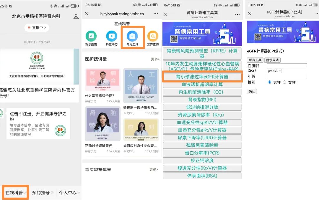 ▲清华大学附属垂杨柳医院公众号内链接的肾小球滤过率计算工具