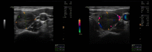 超声所见:甲状腺双叶弥漫性改变,回声不均,内见许多散在低回声区,左叶中部见一个实性低回声区,大小约28×14mm,形态规则,边界清,内部回声不均匀,CDFI:其周边及内部见较丰富血流信号,TI-RADS-3级。