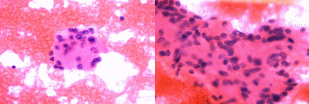 甲状腺-FNA:可见较多量甲状腺滤泡上皮细胞,排列松散或小团状,细胞核增大、拉长,核沟和核内假包涵体易见,背景中可见均质粉染透明变物质。