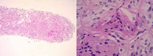 甲状腺-粗针活检:瘤细胞排列呈小梁状、器官样结构,细胞梭形或呈多角形,长轴垂直于基底膜,胞质丰富,嗜酸或透明,核沟及核内假包涵体,未见核分裂象,细胞巢间可见透明变的基底膜样物质沉积。