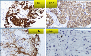 免疫组化结果:CK7、TTF-1、CD56、C117呈弥漫阳性,TG、Galectin-3呈灶状阳性,CK19、CT、CEA、CgA、S-100、CT、MC、P63、TPO、Braf呈阴性,Ki67(SP6/MIB-1)胞膜/胞质均呈阴性,核增殖指数<1%,胶原Ⅳ显示透明变基底膜样物质阳性。