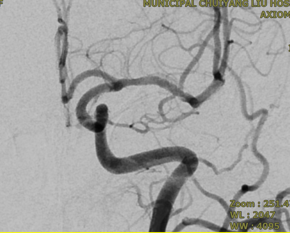 为精准把握手术指征与安全,术前,需完善全脑血管造影对动脉瘤的形态、大小及载瘤动脉的血管条件进行全面评估;术中,需由经验丰富的神经介入医生精准将密网支架植入病变部位;术后,患者需严格遵医嘱服用抗血小板药物,以预防支架内血栓形成及缺血性卒中事件的发生,并需定期复查全脑血管造影,以评估动脉瘤的最终闭塞情况。本例患者行密网支架植入术后三个月复查全脑血管造影,结果显示密网支架贴壁良好,无支架内血栓形成,继续用药和定期复查即可。