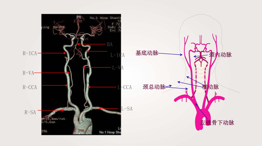 头颈部CTA即头颈部CT血管成像,是经静脉注入含碘造影剂后,经过CT机扫描,通过不同组织对X线的吸收差异,形成不同灰度的图像,再经过后处理软件去除骨及软组织,形成血管三维重建图像,具有快速、无创、并发症少、特异性和敏感性高、时间和空间的分辨率强的特点。