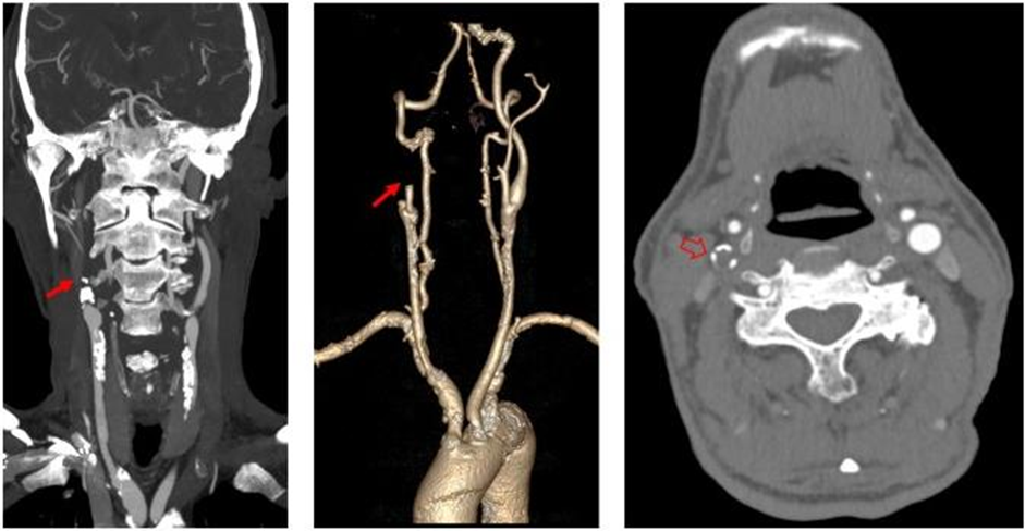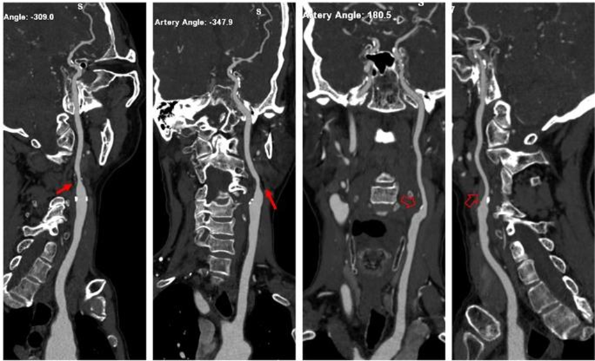 左侧颈内动脉起始部混合密度斑块,管腔中度狭窄(红箭);右侧颈内动脉起始部钙化密度斑块,管腔轻微变窄(空心箭)。