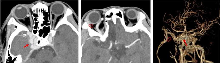 右侧颈内动脉海绵窦瘘:右侧海绵窦明显增大,血管迂曲增粗(红箭),右侧眼上静脉明显增粗(空心箭)。
